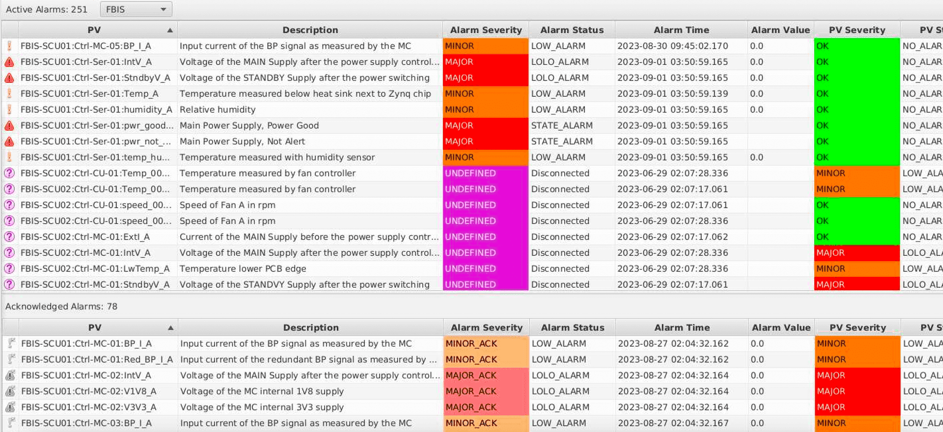 The Alarm Table application displays the current state of alarms in the control system. Its interface will show all current alarms and give operators helpful information on what each alarm means and the steps needed to address the issue. Alarms can be acknowledged, which moves them to a separate table of acknowledged alarms.