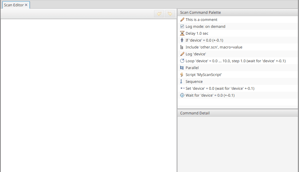 The Scan Editor application is the interface for creating the logic for a specific scan. It gives a drag and drop interface for adding commands such as conditional branches, wait calls, step loops, and calling scripts. Once the logic is completed and submitted, the scan is run on a central server.
