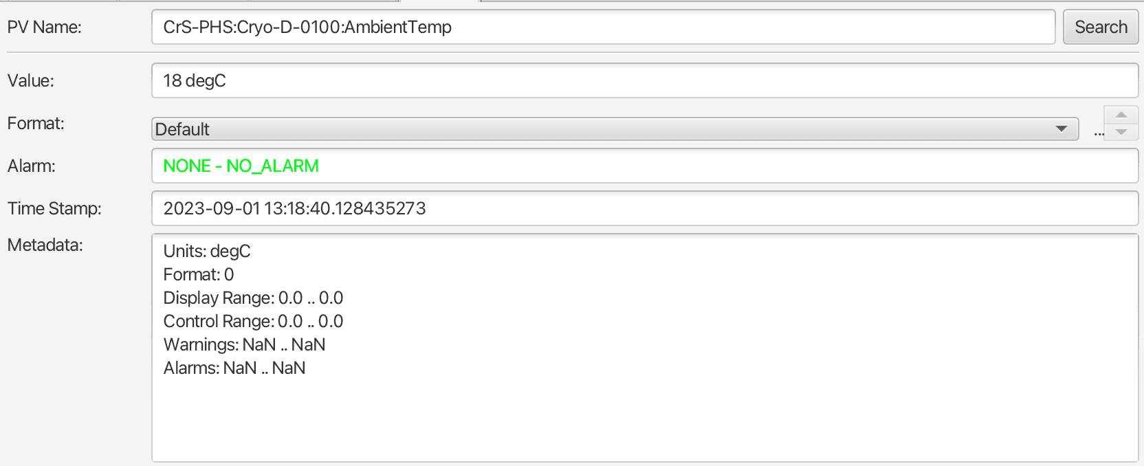 The Probe tool allows users to quickly view the current value and status of a control system signal. The current alarm state, last update timestamp, and any PV meta-data are shown. Users can also use Probe to update the value of the PV by clicking into the Value box and typing the new value.