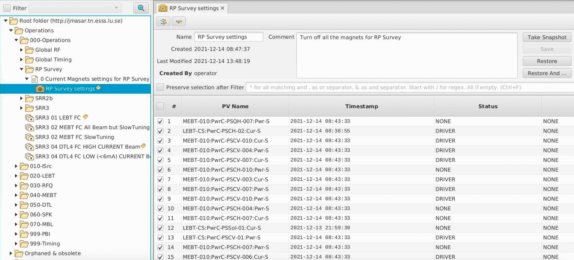 The save & restore application is used to take a “snapshot” of a user-defined list of PV values. Typical use case is to save the configuration of a subsystem when it has been tuned to a wanted state. Snapshot data can be used to restore the PV values in order to put the subsystem back to the same state. In the client application users may modify values or exclude PVs prior to restore.