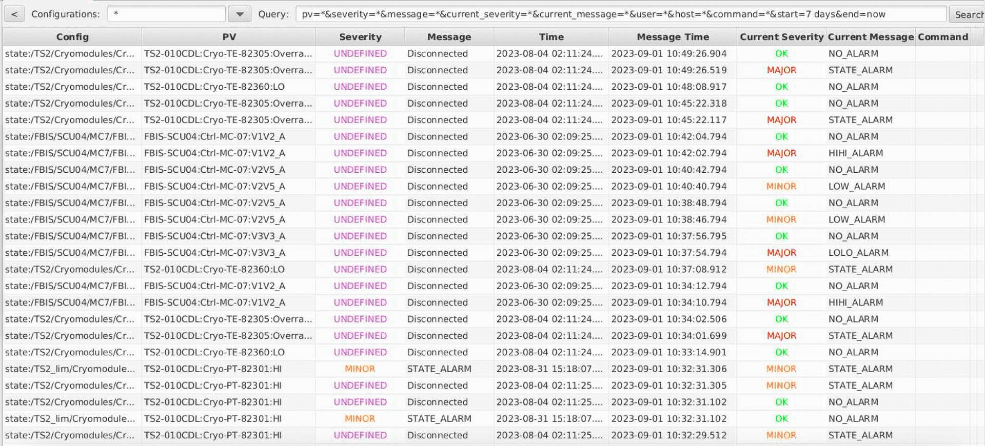 In order for the alarm system to be effective and functional, proper configuration and periodic tuning is essential. While the Alarm Table displays the current state of the control system alarms, the Alarm Log Table gives users a view of past alarm events. The user interface allows users to effectively search, filter, and parse through the archived alarm messages which can help to better understand past events and better configure the Alarm Server for the future.