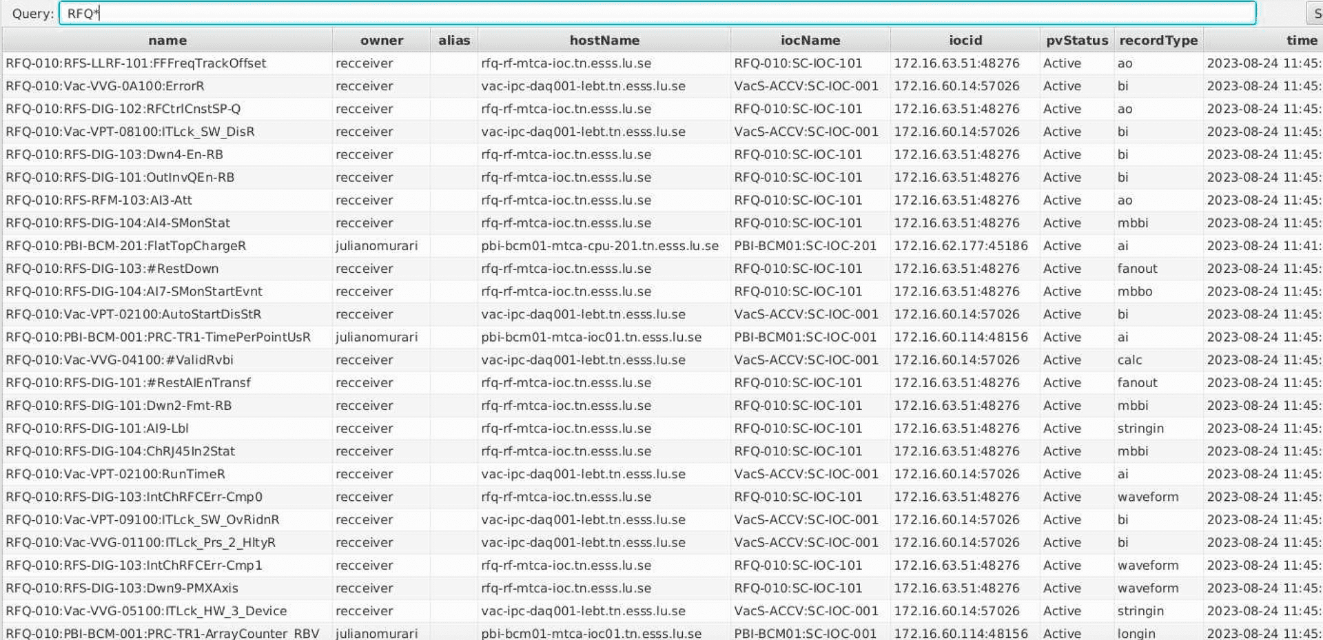 The Channel Table application features a search box that queries the control system directory service for a list of channels that match certain conditions, such as physical functionality or location. Queries will result in a list of PVs that match the filter along with various PV metadata including the IOC Name, Host Name, Record Type, Description, and PV Status. Channel Table also provides mechanisms to create new metadata, allowing for different perspectives of the same set of channel names.